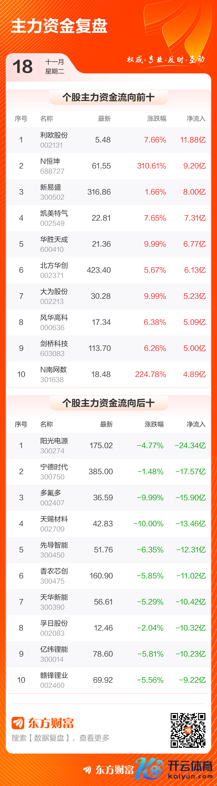 主力净买入个股中,利欧股份排行第一,主力净买入11.88亿元;N恒坤排行第二,主力净买入9.20亿元。