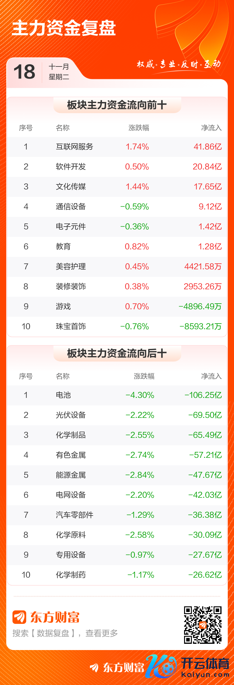 11月18日,沪指跌0.81%,深成指跌0.92%,创业板指跌1.16%。两市成交额1.93万亿,较上个往异日放量153亿。数据深入,当天大盘主力资金净流出993.93亿。互联网工作、软件修复、文化传媒等板块主力资金流入排行居前,其中互联网工作净流入41.86亿元。