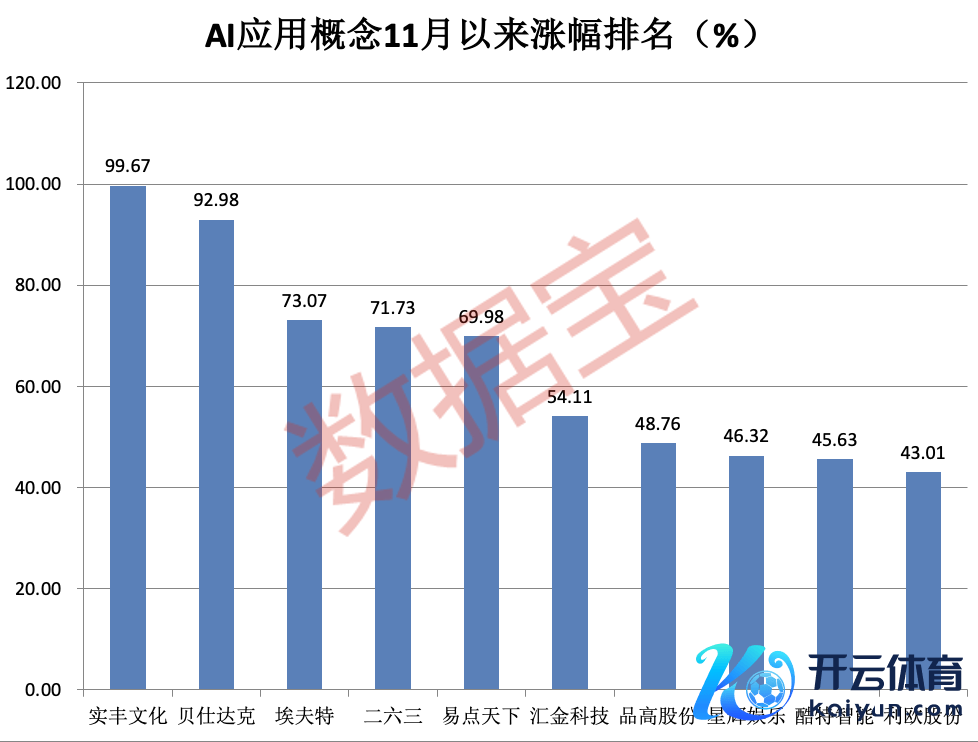 热度握住攀升,AI想法股近期发扬不俗。据证券时报·数据宝统计,为止11月26日,有130多只AI想法股11月以来涨超10%,实丰文化涨近100%居首,贝仕达克、埃夫特、二六三涨逾70%,易点天地、汇金科技均涨逾50%。