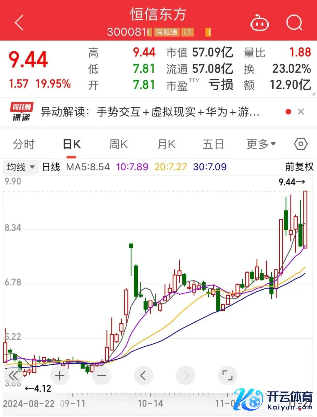 为止上昼收盘,该股报9.44元,高涨19.95%,创出阶段新高。恒信东方有稠密时下热门题材,包括IP经济、婴童想法、AIGC想法、算力租借想法等。