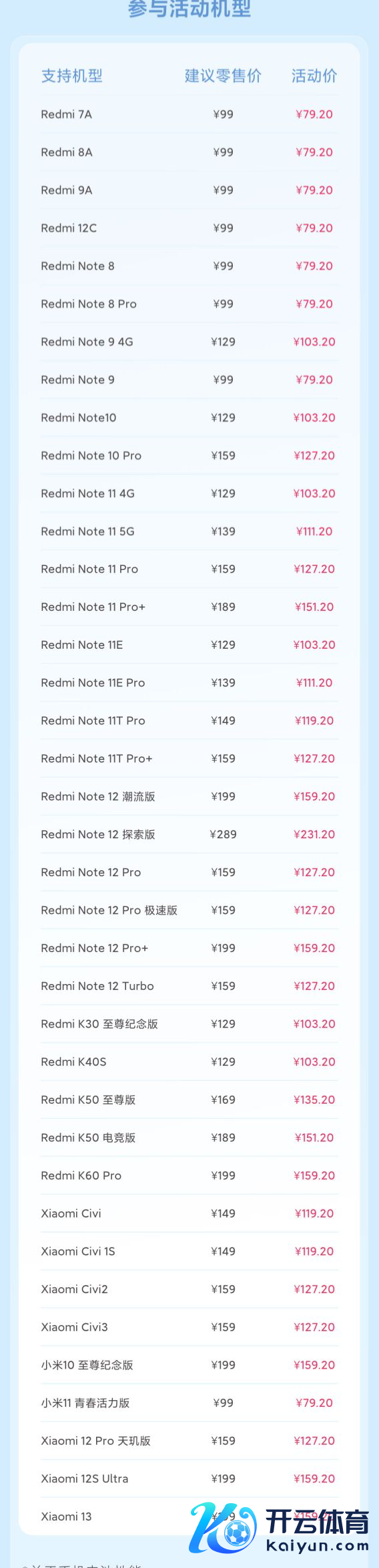 Redmi 7A、Redmi 8A、Redmi 9A、Redmi 12C、Redmi Note 8、Redmi Note 8 Pro、Redmi Note 9 4G、Redmi Note 9、Redmi Note10、Redmi Note 10 Pro、Redmi Note 11 4G、Redmi Note 11 5G、Redmi Note 11 Pro、Redmi Note 11 Pro+、Redmi Note 11E、Redmi Note 11E Pro、Redmi Note 11T Pro、Redmi Note 11T Pro+、Redmi Note 12 潮水版、Redmi Note 12 探索版、Redmi Note 12 Pro、Redmi Note 12 Pro 极速版、Redmi Note 12 Pro+、Redmi Note 12 Turbo、Redmi K30至尊记挂版、Redmi K40S、Redmi K50至尊版、Redmi K50电竞版、Redmi K60 Pro。
