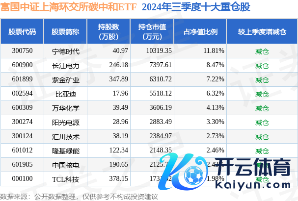 富国中证上海环交所碳中庸ETF为指数型-股票基金,凭证最新一期基金季报露馅,该基金钞票成立:股票占净值比99.57%,无债券类钞票,现款占净值比0.47%。基金十大重仓股如下: