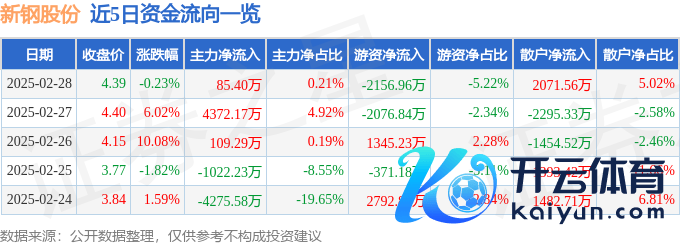 本站音信开云体育(中国)官方网站,边界2025年2月28日收盘,新钢股份(600782)报收于4.39元,下降0.23%,换手率2.99%,成交量94.02万手,成交额4.13亿元。